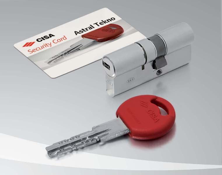 ΣΧΟΛΙΑ: Ο κύλινδρος ασφαλείας ΑΣΤΡΑΛ ΤΕΚΝΟ της εταιρείας CISA έχει σχεδιαστεί για να παρέχει την πιο υψηλή προστασία αντιδιάρρηξης.Το κλειδί του είναι πατενταρισμένο για να μην αντιγράφεται και στην περίπτωση που κάποιος το επιλέξει μπορεί να γράψει πάνω στο κλειδί το όνομά του.Το ειδικό κλειδί είναι φτιαγμένο με μακρύ λαιμό και πλαστικό κεφάλι ,για το defender κατάλληλο.Υπάρχει κωδικός στην κάρτα ασφαλείας.Οι διαστάσεις είναι των 60,2mm σε νικέλ όπου παραδίδονται 5 κλειδιά στον πελάτη και 80,2mm σε νικέλ όπου παραδίδονται 3 κλειδιά στον πελάτη.Εκτός των διαστάσεων των 60,2mm όλοι οι κύλινδροι ΑΣΤΡΑΛ ΤΕΚΝΟ έχουν σύστημα clutching το οποίο λειουργεί διπλά.